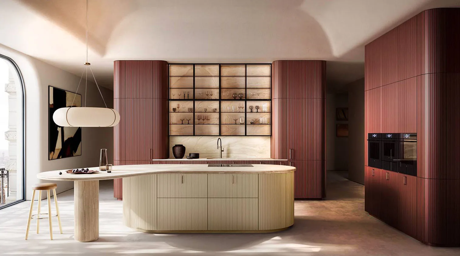 Anche le geometrie raccontano un cambiamento meno superficiale di quanto possa sembrare. Le curve, già viste negli ultimi anni, oggi perdono la funzione decorativa e diventano strumento per destrutturare il blocco cucina.