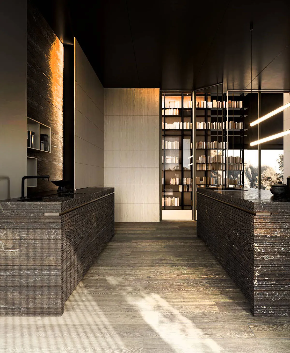 La pietra viene alleggerita ma resta visivamente massiva, i metalli diventano superfici attive che reagiscono alla luce, l’acciaio si lavora come un materiale “nobile” e non più solo tecnico. È una trasformazione che segna il passaggio dalla cucina industriale a una dimensione quasi “materica-scultorea”.