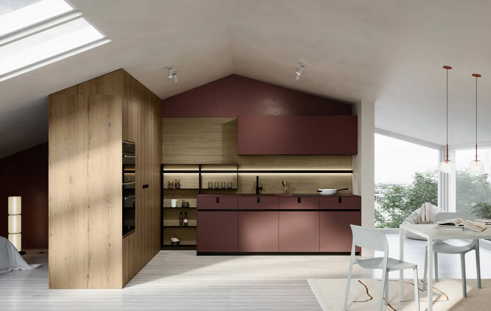 Quando la cucina si affaccia sulla zona giorno, diventa parte integrante dell’arredo complessivo. In questi casi, una tonalità decisa abbinata a finiture opache riesce a farsi notare con stile, senza invadere lo spazio. La cucina diventa così un elemento scenografico che dialoga con living e area pranzo, valorizzando l’intero ambiente domestico.