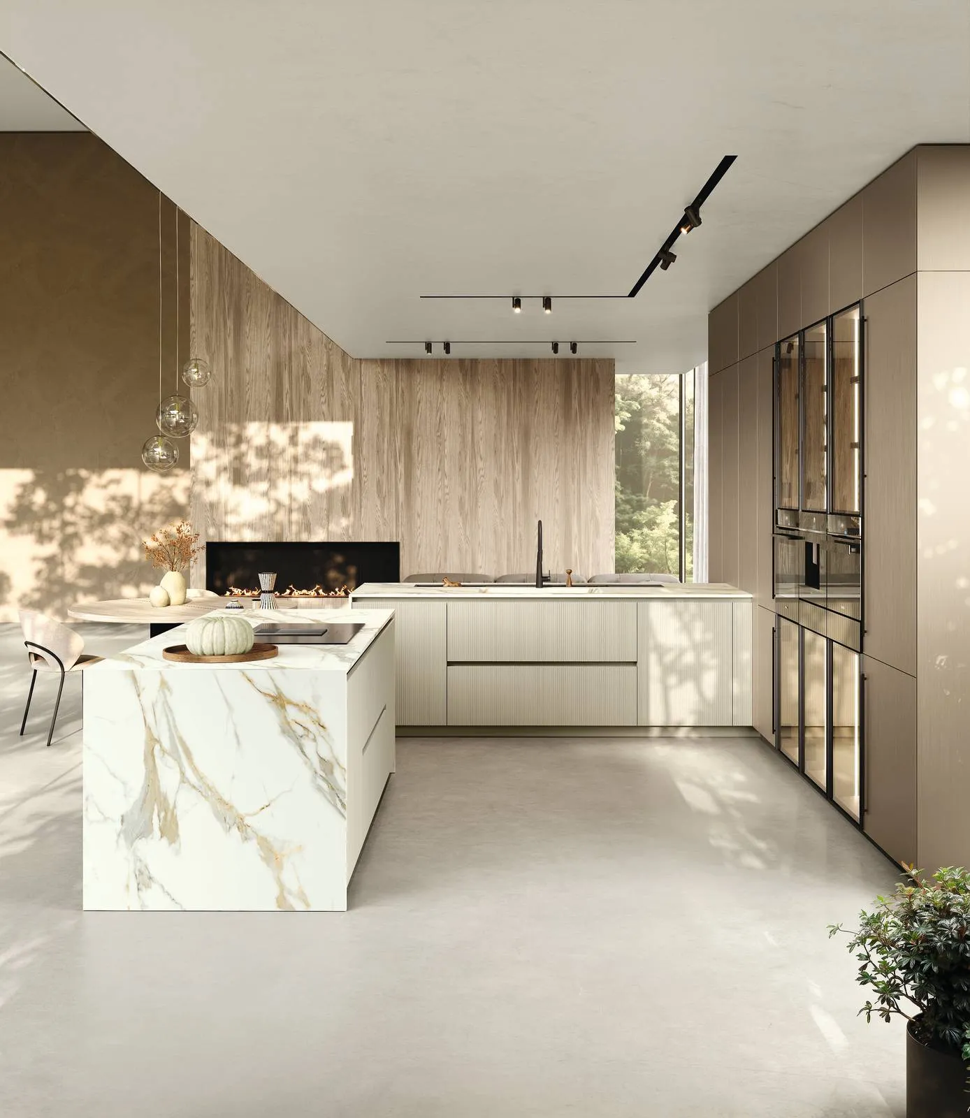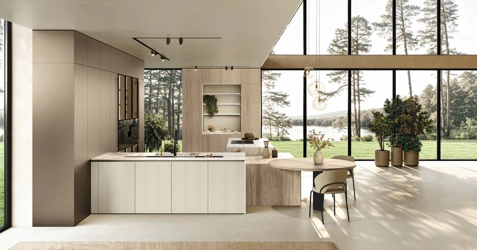 I blocchi operativi centrali accolgono le funzioni di lavaggio e cottura, mentre le colonne concentrano gli elementi contenitivi, gli elettrodomestici e le vetrine Slim integrate con telaio nero e vetro, retroilluminate, che alleggeriscono l’estetica. Una suddivisione che migliora l’ergonomia e semplifica l’uso quotidiano.