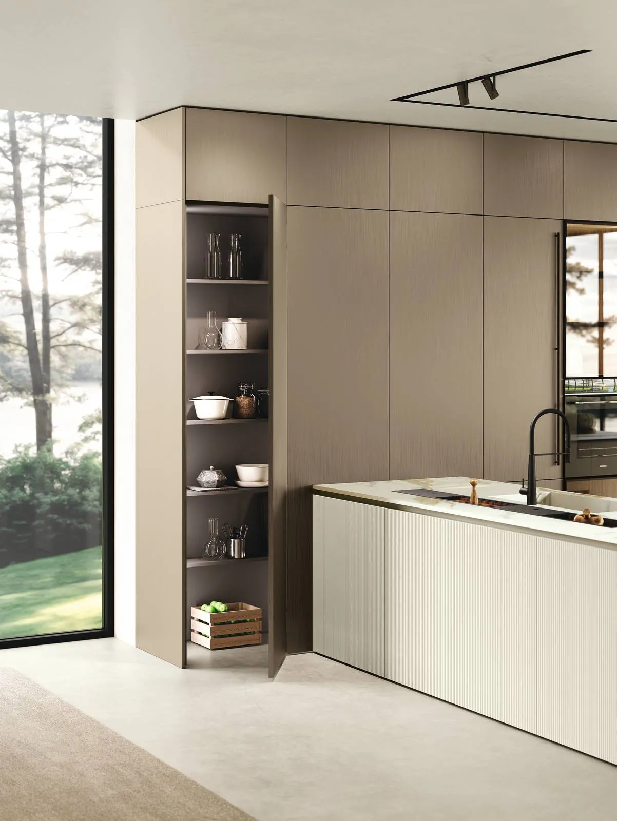 Nelle ante, il laccato opaco Color Trend finitura Burro, finemente fresato con micro-doghe verticali Trace, aggiunge profondità visiva, offrendo una superficie tattile discreta e riconoscibile. Il fianco dell’isola e il top – che integra vasca e piano cottura con rigore estetico – sono in Neolith Calacatta Roma Silk.
