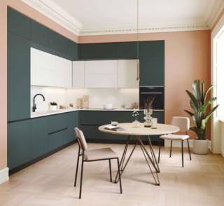 Gioca con un mix di colori la cucina Pratica 2425 di La Casa Moderna che si articola ad angolo ed è caratterizzata dalle basi e dalle colonne in nobilitato verde scuro e dai pensili in laccato lucido bianco che danno vita ad un raffinato contrasto con le pareti rosa. Il top è in laminato bianco. Prezzo a partire da 8.550 euro (con kit elettrodomestici, lavello e miscelatore; esclusi cappa e accessori). https://lacasamoderna.com
