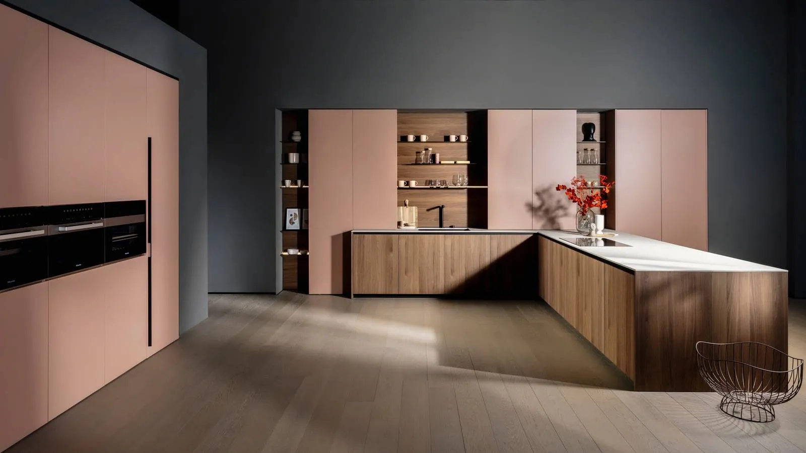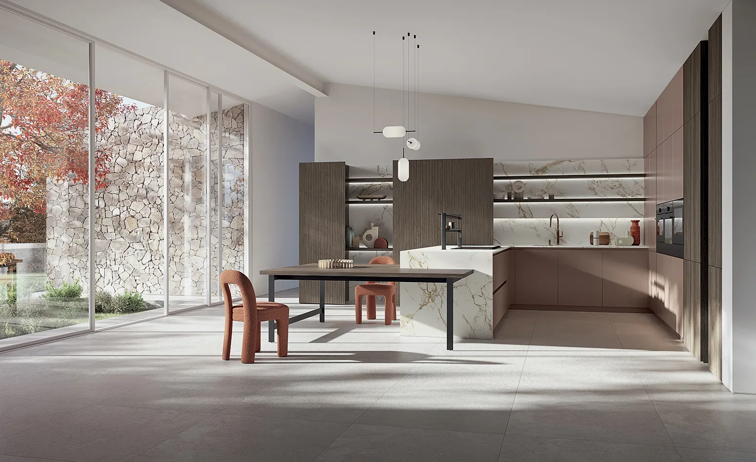Ante lisce in laccato rosè per il modello che fa parte del sistema I Naturali di Ar-Tre cucine ed è dotato di una penisola con un grande tavolo da pranzo impiallacciato frassino tinta Wave Dark. Il top, i fianconi e gli schienali sono realizzati in Dekton Entzo; le ante delle colonne, realizzate in legno cannettato scuro, sono più larghe della scocca. Prezzo su richiesta. https://www.ar-tre.it