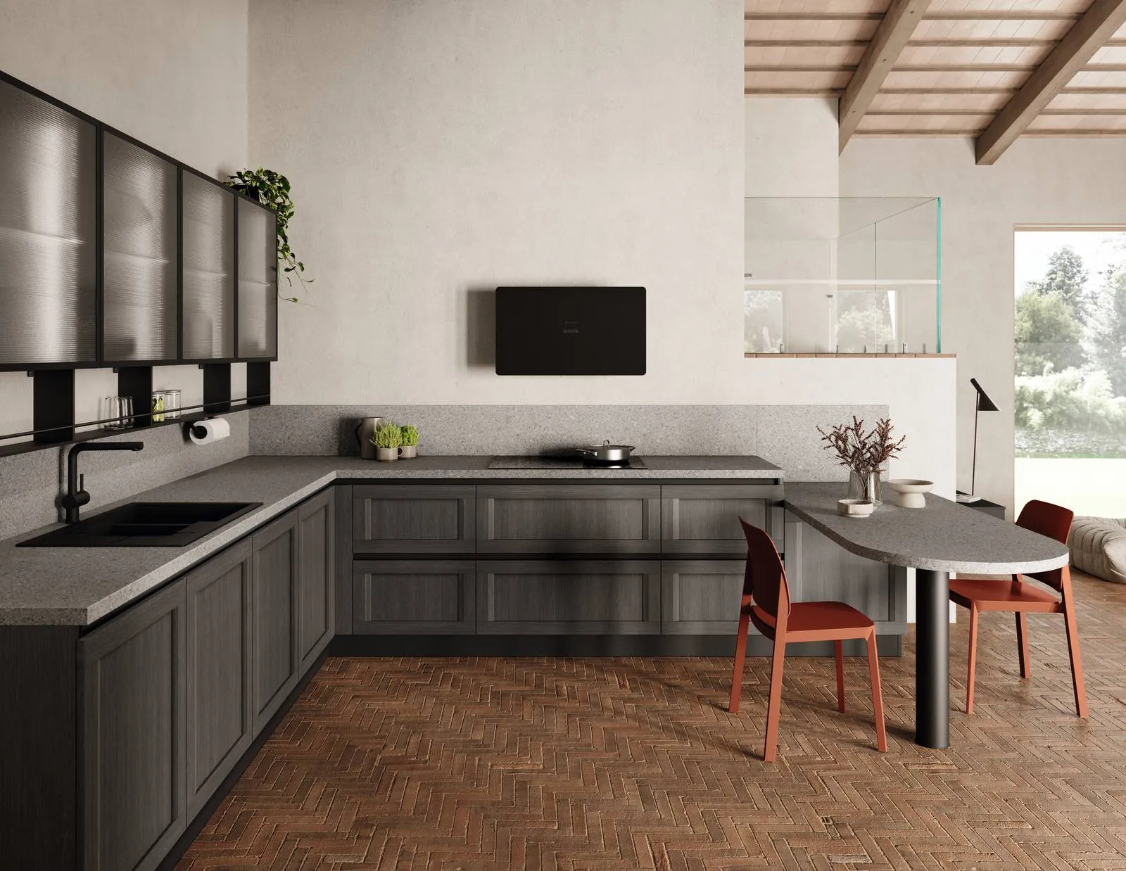 Ante a telaio in decorativo Rovere Town per la composizione angolare Regola di Scavolini chè è caratterizzata dalla presenza di un tavolo/penisola laterale con il piano in Laminato Street Grey coordinato con il top. I pensili con vetro Screen alleggeriscono l’ambiente. Prezzo su richiesta. https://www.scavolini.com