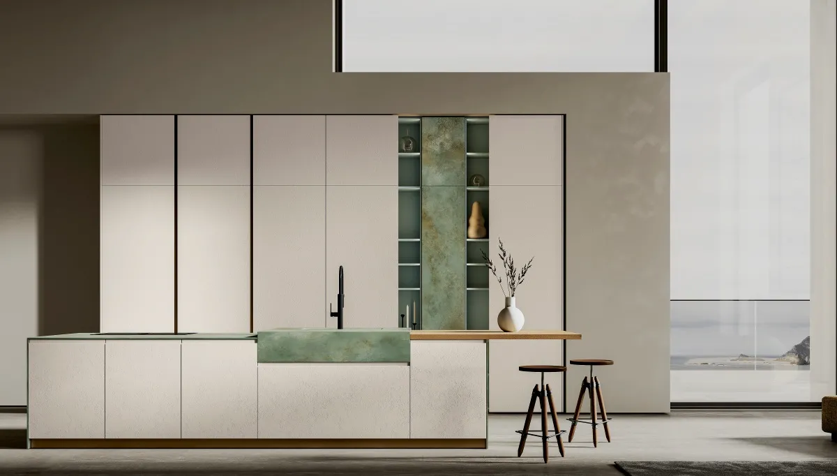 L’anta Gea di Arrex nasce dall’unione di ricerca stilistica e pensiero green. È proposta in cinque finiture eco PET, tre cementi PET 100% riciclabili e una selezione di colori laccati raccolti in quattro mood: Aria, Acqua, Terra e Fuoco. Le nuove finiture PET cemento e Eco PET liscio vestono le ante Gea e Loft 2.2. La cucina legata all’elemento Acqua offre colori rinfrescanti come il bianco e il verde abbinati a soluzioni innovative, che si combinano per creare uno spazio che richiama la serenità e la fluidità dell’acqua. Colonna e sopracolonna finitura Gres Ossido Verderame. Piano snack finitura Wood impiallacciato Rovere Naturale. Colonne e pensili sopra colonna PET Creta. PET colori di serie: 204 euro + Iva. http://www.arrex.it