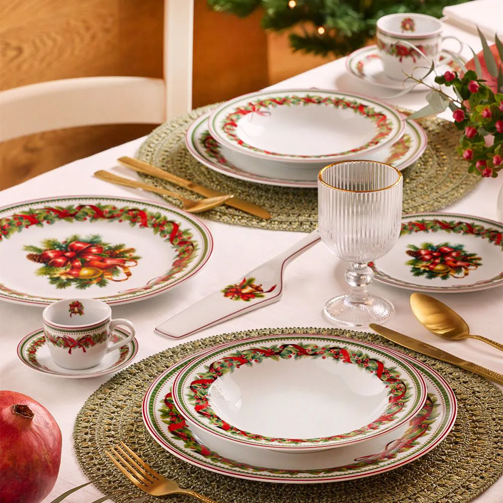 Per la tavola di Natale, si può cominciare scegliendo il servizio di piatti e poi abbinare via via tutti gli altri accessori: bicchieri, posate, tovaglie, decori vari… I piatti decorati, con motivi più o meno stilizzati, mixano a volte le tradizionali tonalità del rosso e del verde o ancora di più dell’oro, che con il suo sfavillante calore sembra sovrastare la più fredda eleganza dell’argento.