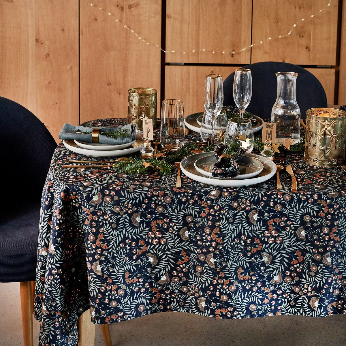 Una raffinata fantasia floreale su fondo blu notte per la tovaglia Majari di La Redoute Interieurs che rende speciale ogni apparecchiatura per le feste. È realizzata in puro cotone lavato e ha un aspetto leggermente stropicciato; è disponibile in quattro formati. Misura L 150 x P 300 cm. Prezzo 44,99 euro. https://www.laredoute.it