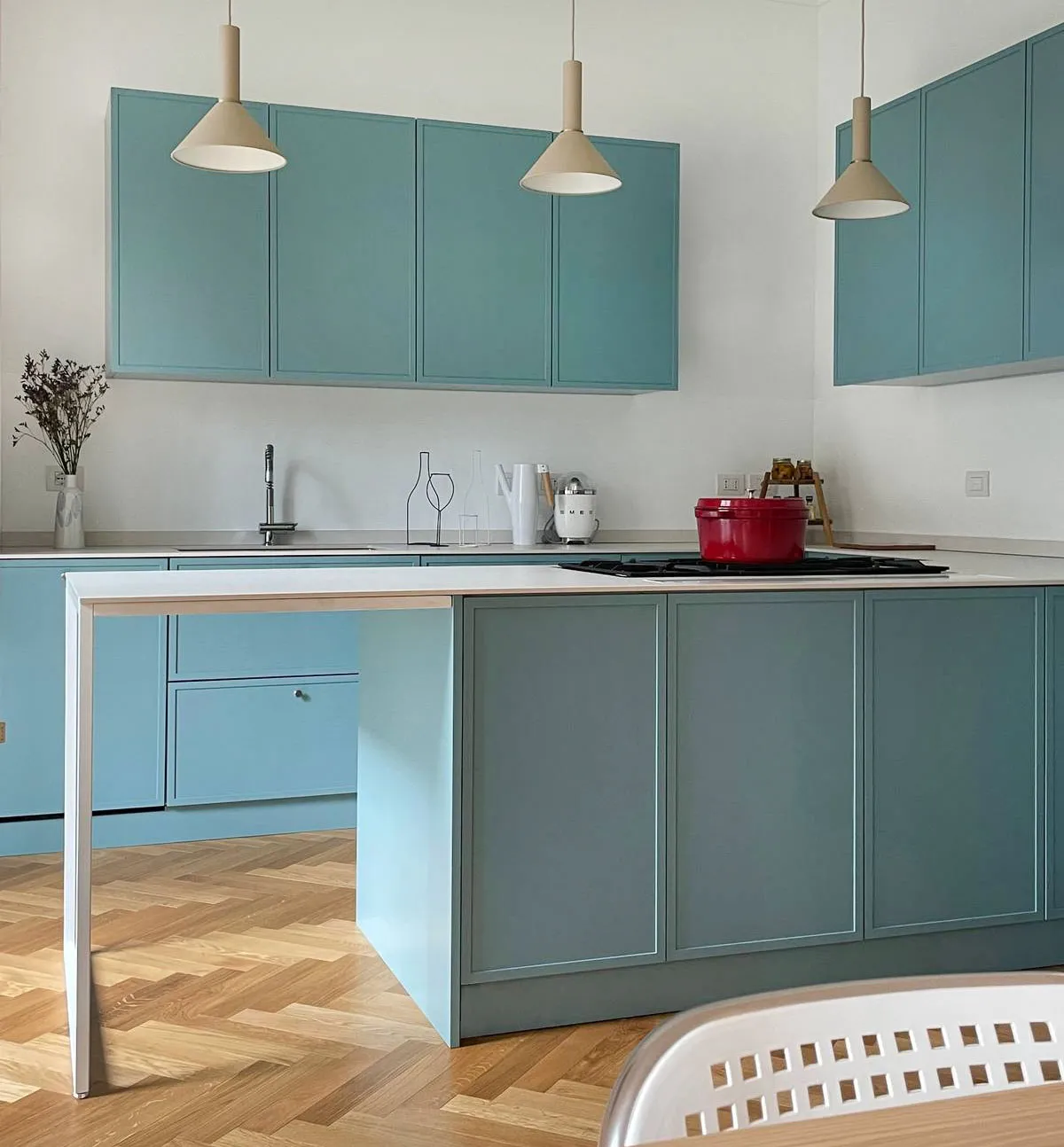 La cucina azzurra e grintosa si distingue per un design deciso. I fuochi a gas sono stati posizionati sulla penisola per cucinare rivolti verso la zona giorno e non guardando il muro.