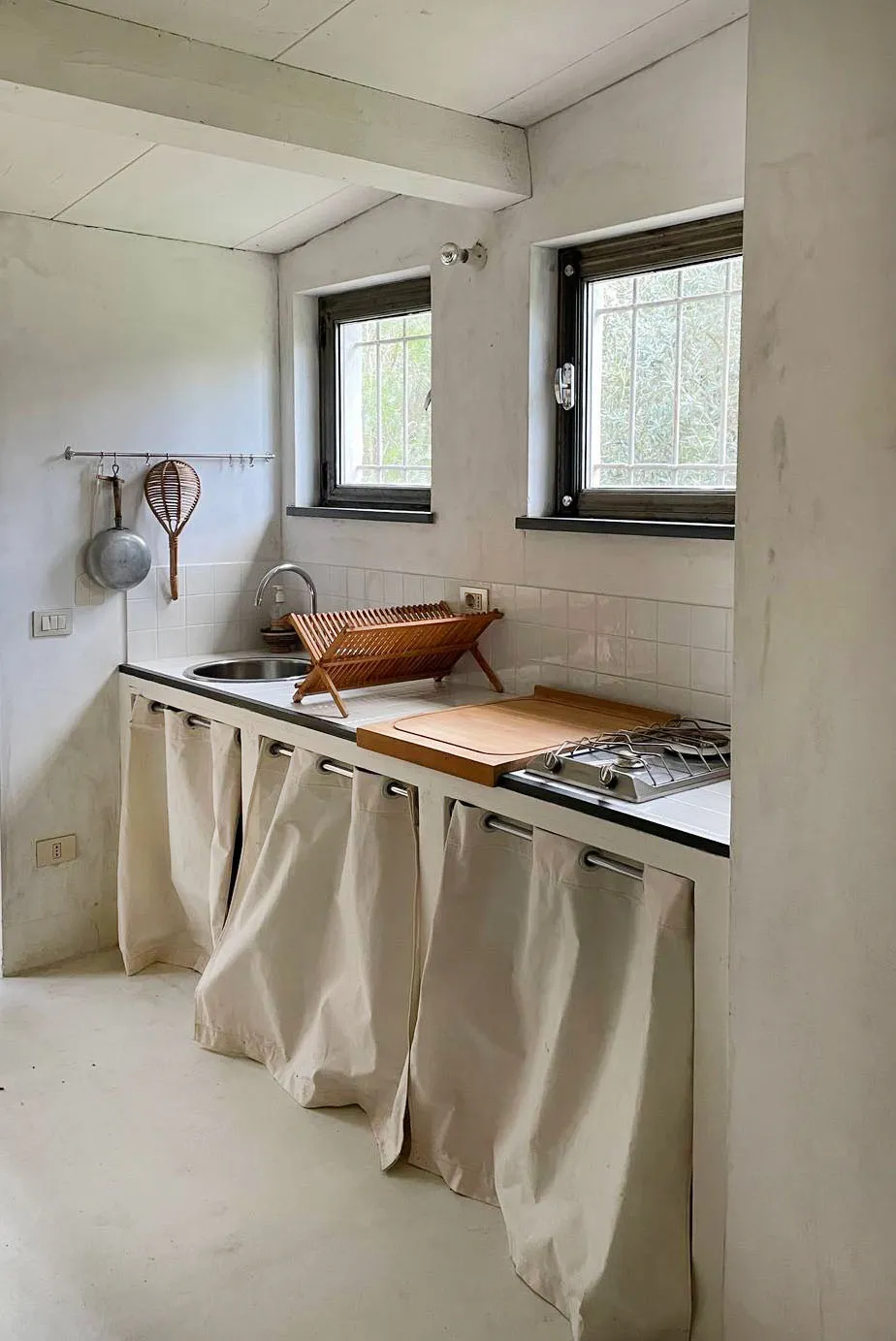 Semplice e spartana, questa cucina è inserita in una casa di campagna, ha il piano rivestito in piastrelle bianche quadrate da 10×10 centimetri e una tenda al posto degli armadi.