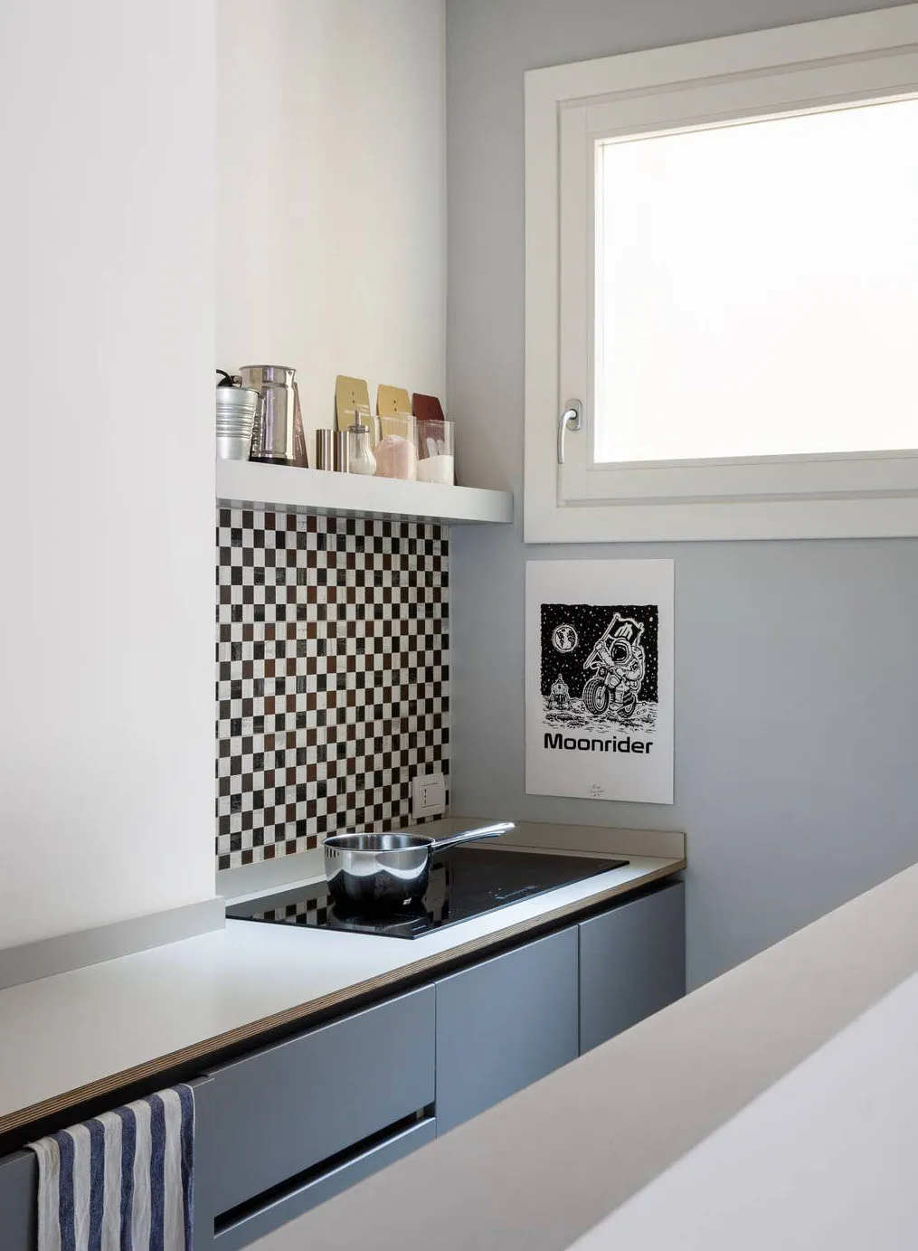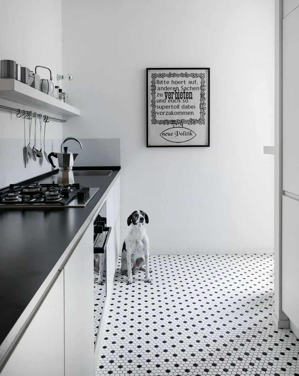 La cucina è declinata in soli due colori, il bianco e il nero, con i mobili e gli elettrodomestici ridotti al minimo indispensabile, ma non rinuncia a una nota decor, data dal pavimento in mosaico con un piccolo disegno.