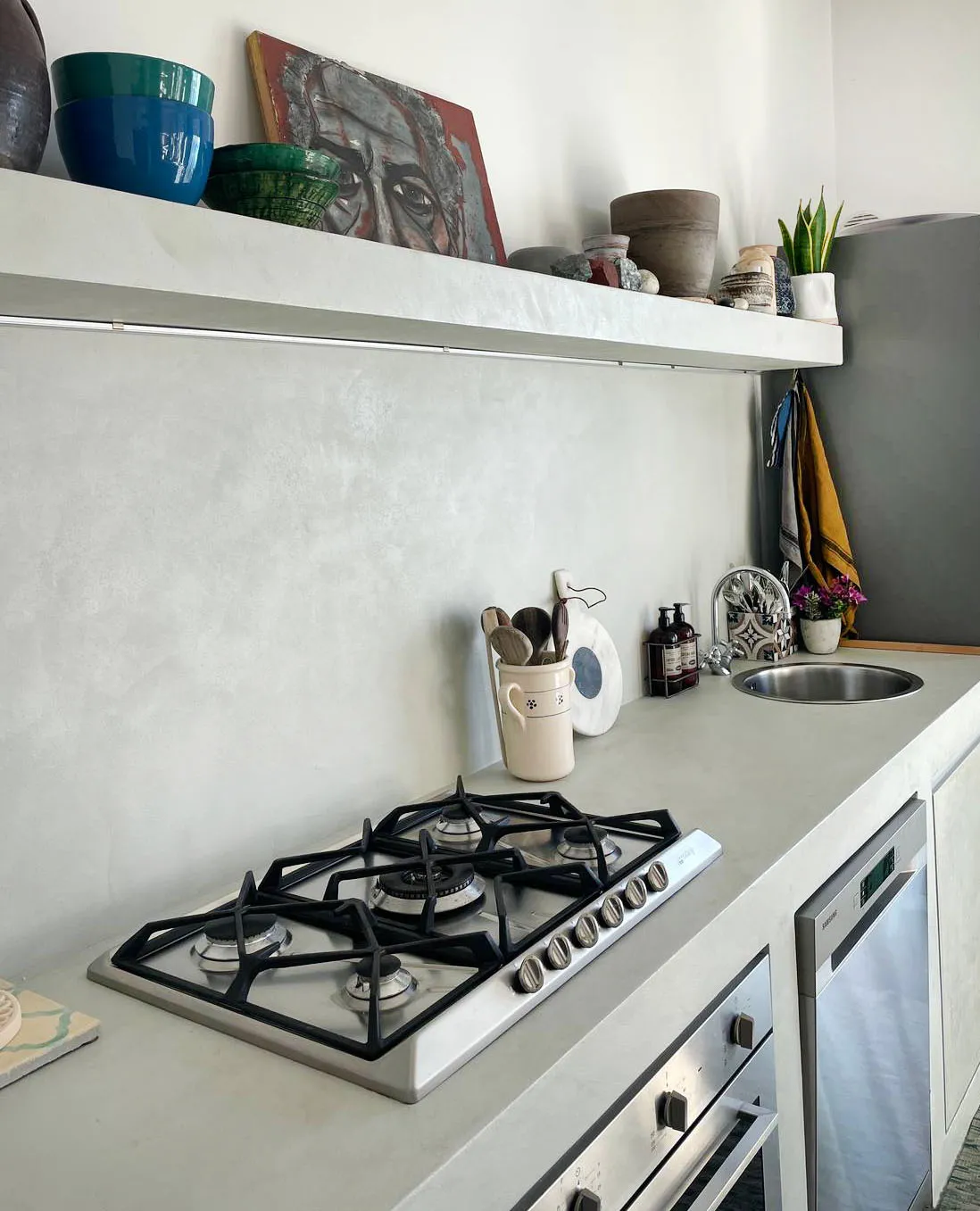 Dallo stile essenziale, questa cucina con elementi ridotti al minimo prevede come materiale il solo cemento lisciato, utilizzato per creare i vani dei mobili, per salire dietro al piano come backsplash e rivestire la mensola che sostituisce i pensili. I fuochi sono 5, a gas con griglie in ghisa, più comodi – quando lo spazio lo consente – del modello tradizionale da 60 centimetri con soli 4 bruciatori.
