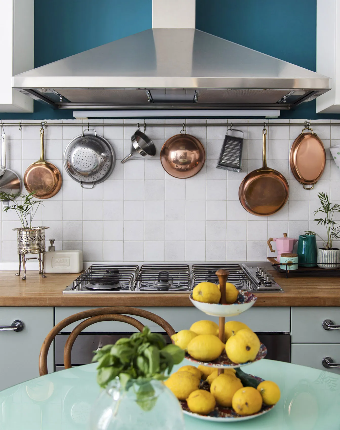 In questa cucina tutto parla di uno stile che si ispira al passato, anche gli accessori, come le pentole in rame appese sulla barra in acciaio.