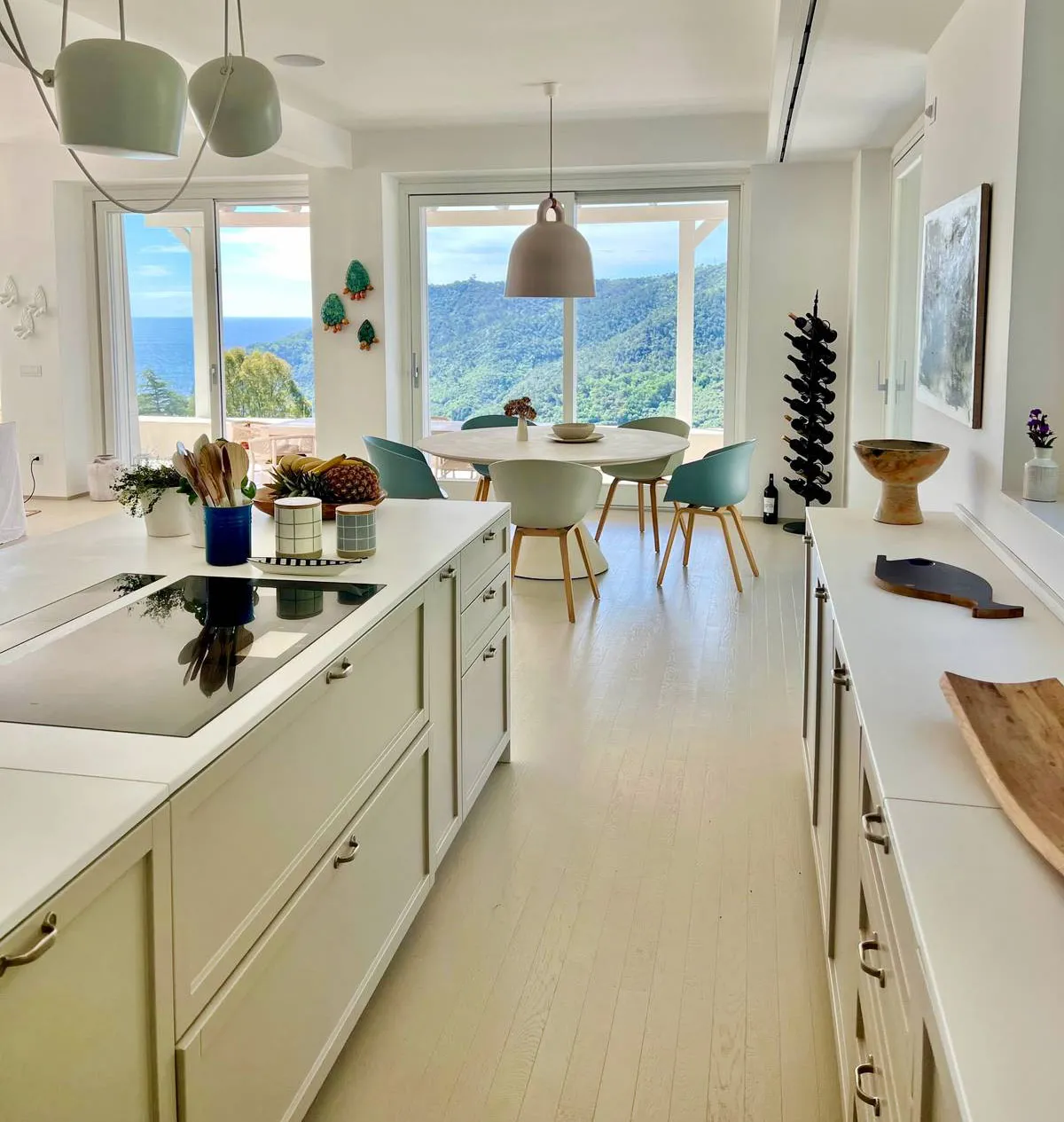 In questa cucina ampia ed elegante, l’isola centrale ospita il piano a induzione con la cappa integrata al centro. I colori scelti sono tutti chiari e soft: il bianco avorio e il verde pistacchio creano un ambiente equilibrato e armonioso, in cui nessun elemento che sovrasta sugli altri.