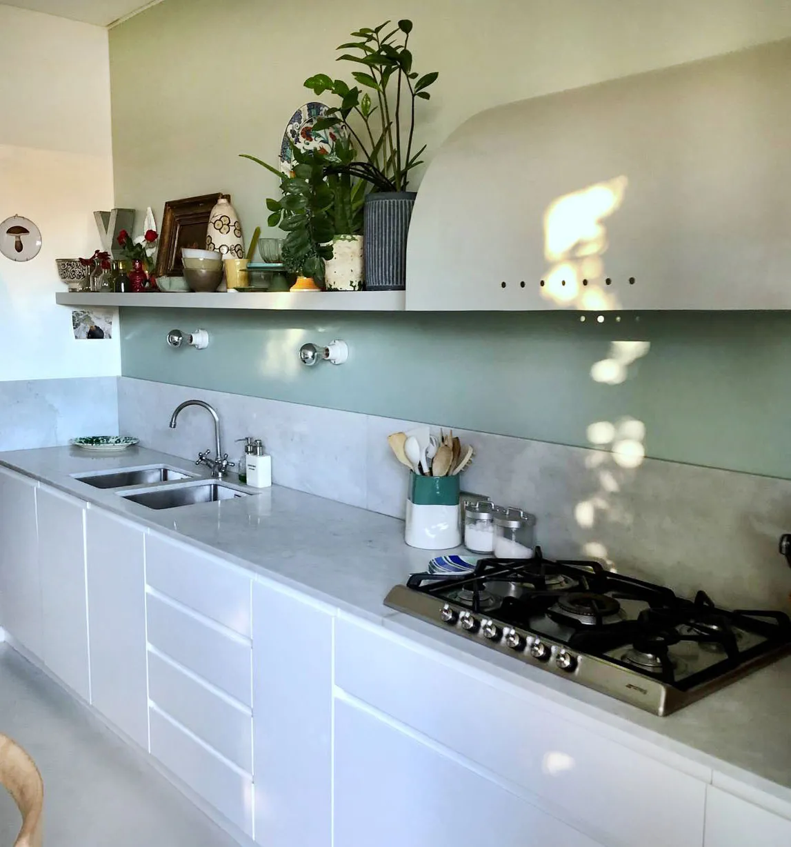 In questa zona giorno con angolo cottura, la cucina doveva assomigliare il più possibile a un mobile. Naturale quindi la scelta di una composizione senza pensili, che si sviluppa lungo una parete, con i mobili lisci e dipinti nello stesso colore del fondo per sparire il più possibile.