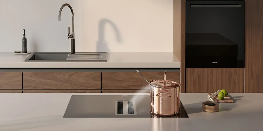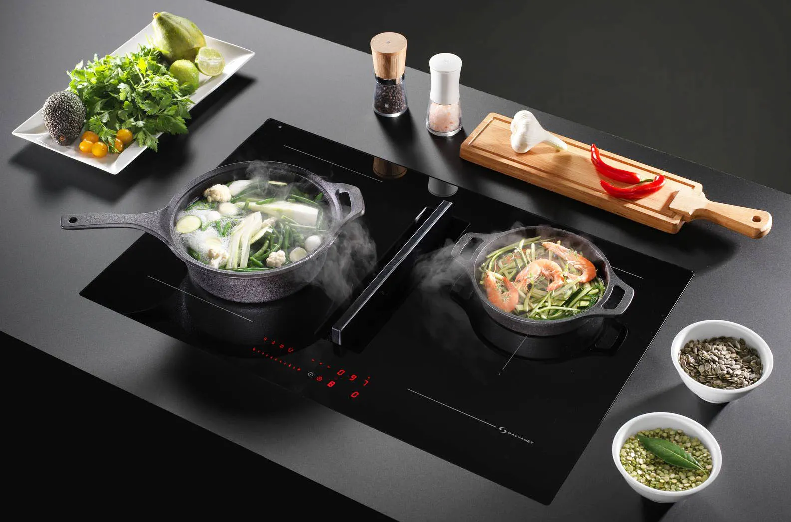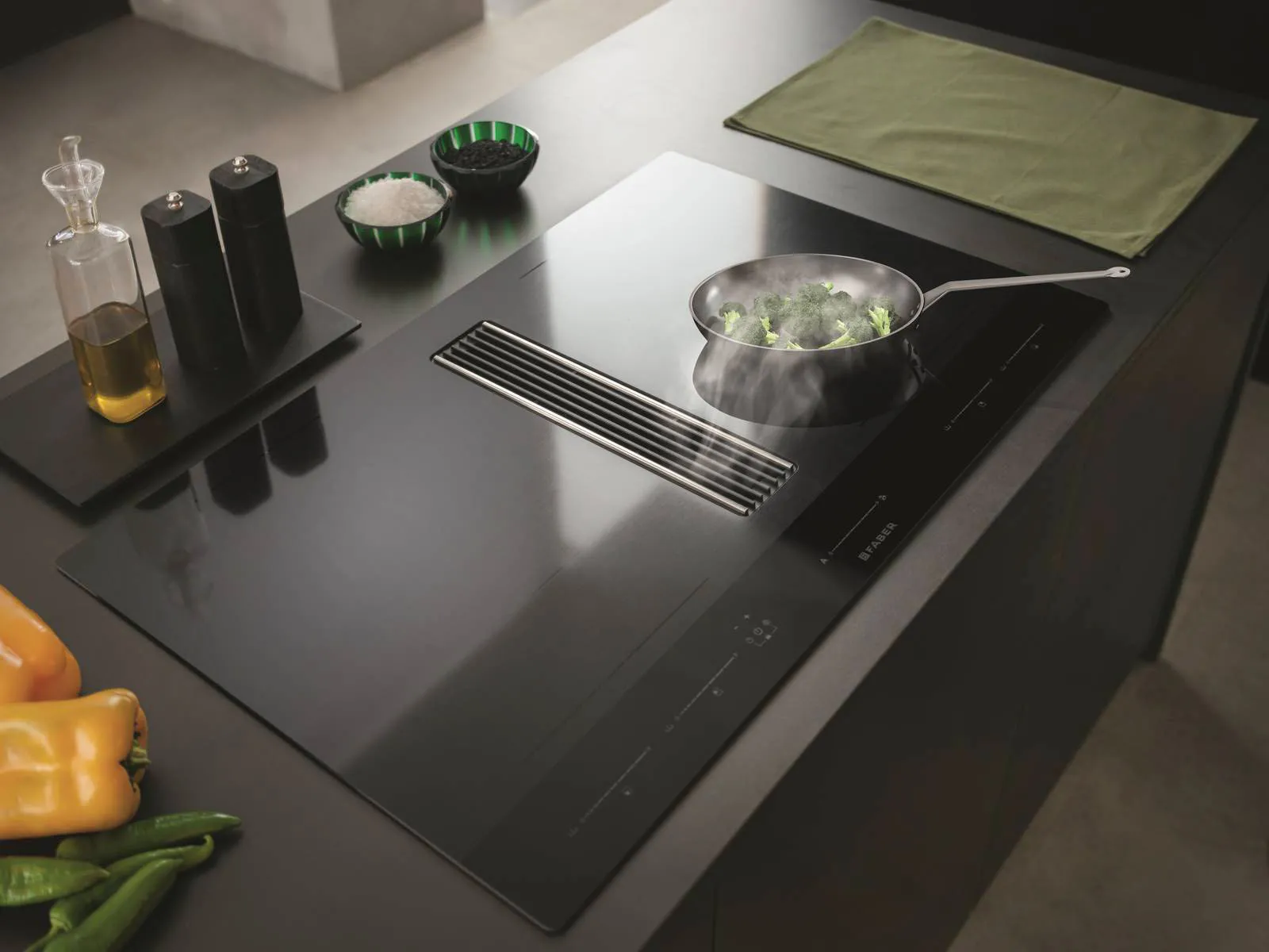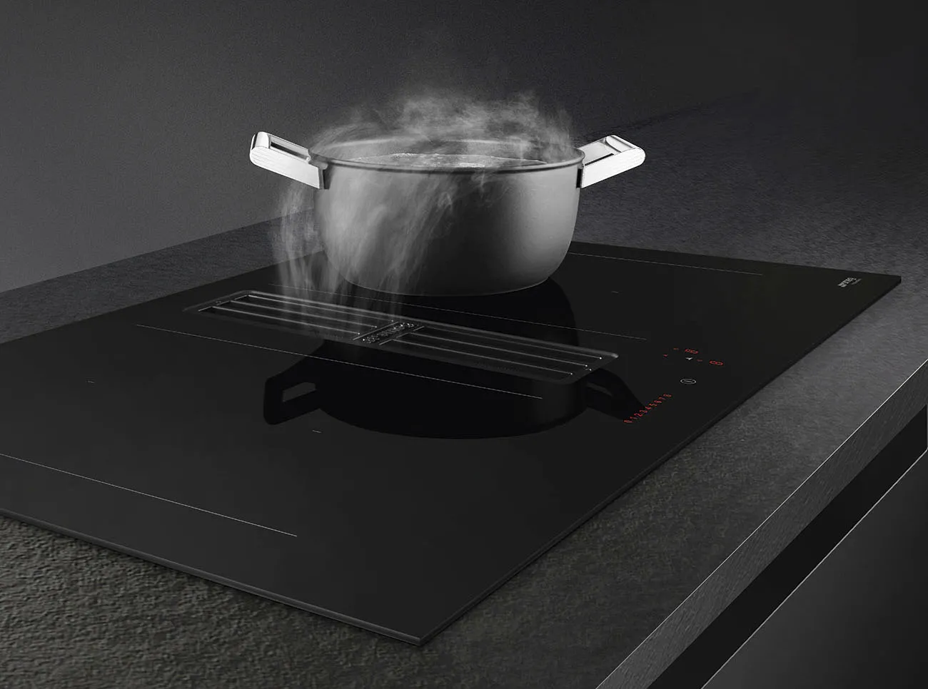 Le versioni più recenti integrano anche la cappa aspirante al centro del piano, con sistemi di aspirazione diretta dei vapori e gestione automatica sincronizzata con le zone di cottura. Questa soluzione, oltre a ottimizzare lo spazio e il design, riduce la necessità di un’unità aspirante separata.
