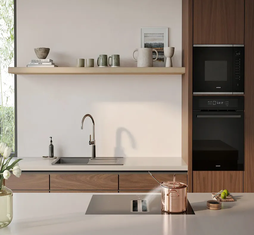 Caratteristiche: La speciale finitura Matt riduce la visibilità di eventuali graffi, mantenendo il prodotto sempre impeccabile e resistente nel tempo. La cappa integrata, dotata di motore senza spazzole silenzioso ed efficiente, può essere installata in modalità a ricircolo oppure ad espulsione. Con il sistema Flex Design è possibile sostituire i listelli laterali, disponibili in quattro finiture: Brushed Bronze, Anthracite Grey, Metallic Silver e Deep Black, così come la manopola magnetica Twist Pad Flex®.