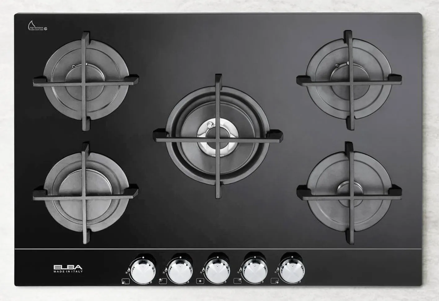 Il fascino autentico della fiamma si unisce all’eleganza della superficie in vetroceramica nera nel piano gas Elio 75 545 CG di Elba. Ha cinque zone di cottura, tra cui un bruciatore doppia corona da 3,8 kW, griglie in ghisa e manopole in metallo spazzolato. Può essere installato a filotop. Misura 75 cm. Prezzo 755 euro. https://www.elba-cookers.com