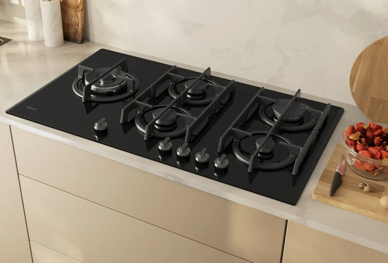 Largo 90 cm e in vetro temperato nero, il piano cottura a gas N 90 T29RHS4S0 di Neff ha bruciatore Dual wok da 5kW con sistema a doppia fiamma e controllo separato delle due corone. La tecnologia FlameSelect® regola l’erogazione del gas con precisione su 9 livelli e le manopole metalliche removibili si illuminano quando sono in uso. Prezzo da rivenditore. https://www.neff-home.com/it