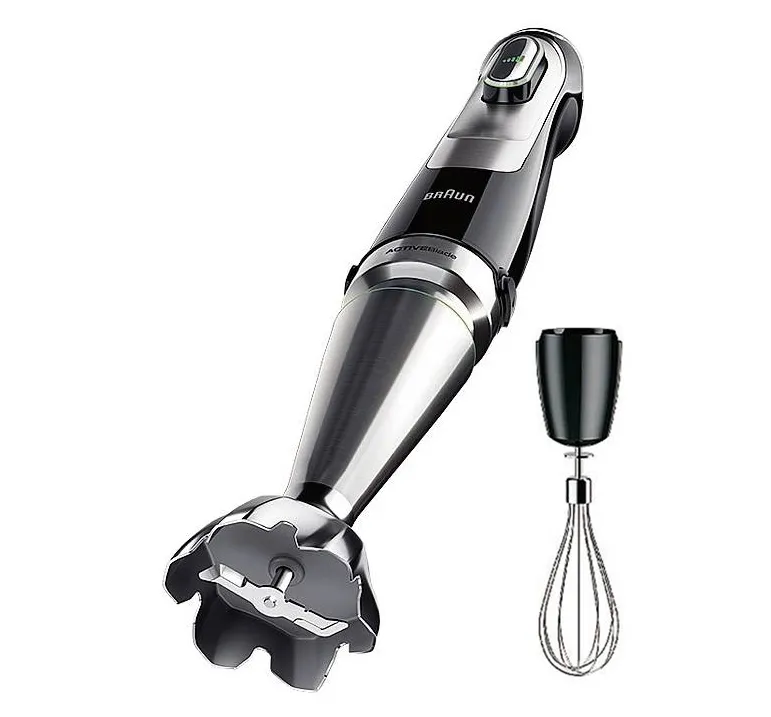 MultiQuick 9 MQ 9195XLI di Braun ha tecnologia Active PowerDrive con motore da 1.200 W. Con ActiveBlade muove la lama verso l’alto e verso il basso e grazie alla tecnologia Imode si può scegliere tra tre impostazioni: a impulsi, a bassa velocità e ad alta velocità. Con bicchiere di plastica da 600 ml, misura H 41 cm; costa 219,90 euro. http://www.braunhousehold.com
