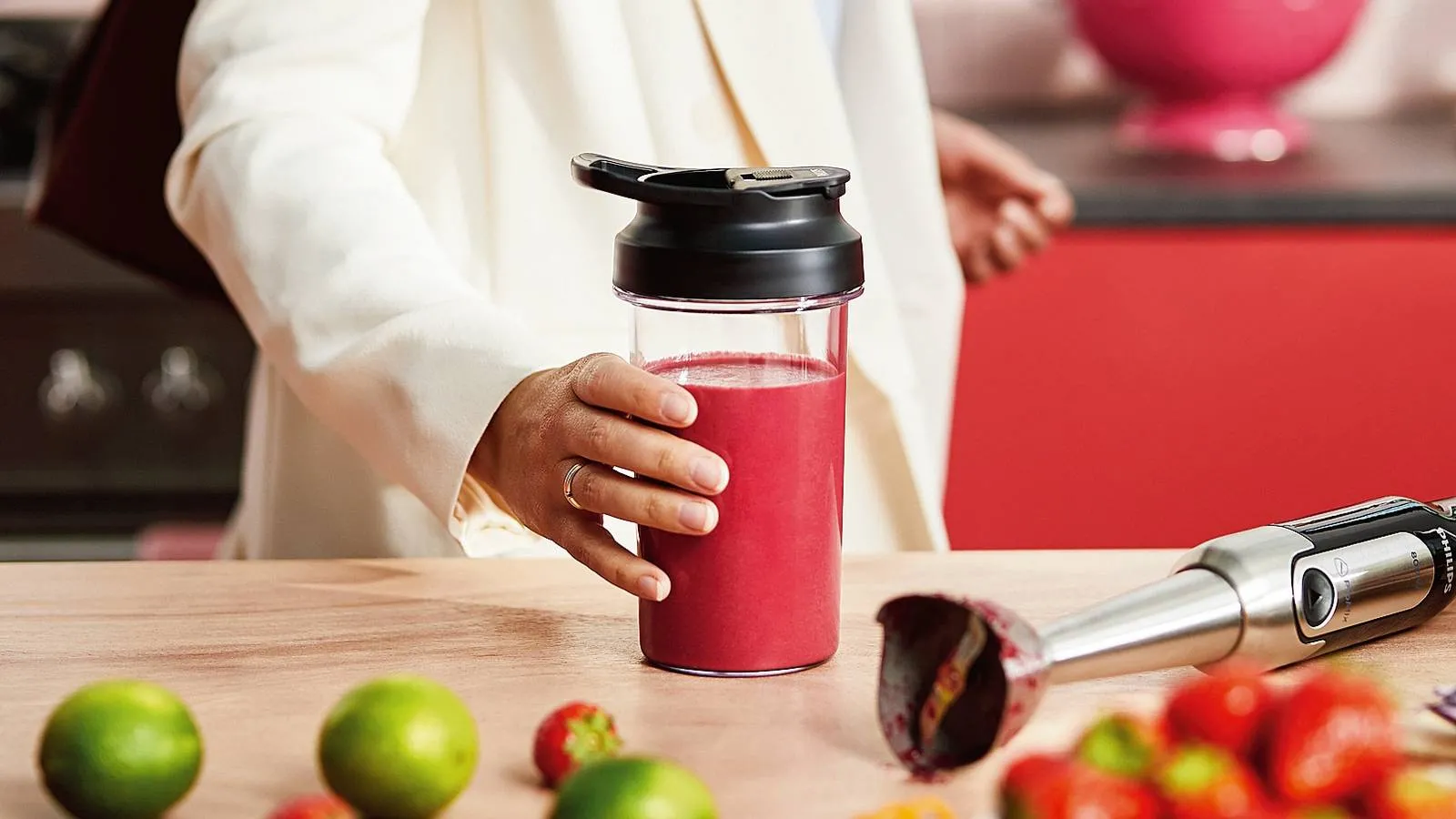 Con motore da 800 W, ProMix Viva Collection di Philips ha tecnologia ProMix per frullare in modo rapido e uniforme; il Turbo Boost aumenta la potenza. È dotato di sistema di sgancio con unico pulsante per cambiare rapidamente gli accessori e di anti-schizzo. È completo di frusta, tritatutto XL e bicchiere da 500 ml. Misura H 22 cm; costa 99,99 euro. http://www.philips.it