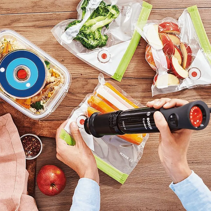 Ha una potenza di 1.000 W ErgoMixx MS6CB61V1 di Bosch con accessorio per la conservazione sottovuoto Fresh Vacuum. È dotato di QuattroBlade che assicura un taglio ottimale grazie al design AntiSplash. Le 12 impostazioni, oltre alla funzione turbo, consentono la giusta velocità per ogni preparazione. Alto 39,3 cm, costa 159,90 euro. http://www.bosch-home.com