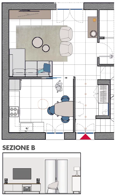Il living non è uno spazio isolato: comunica con ingresso e scala. Arredare la zona filtro con una console o un armadio in una nicchia ben valorizzata – come nel progetto proposto – permette di mantenere ordine e continuità. L’ingresso diventa parte integrante del soggiorno e contribuisce a dare coerenza all’intero ambiente.