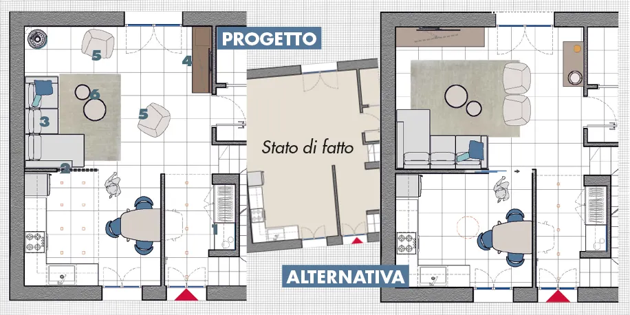 Alla zona giorno si accede attraverso un corridoio d’ingresso che da una parte chiude la zona di pertinenza della cucina, dall’altra accoglie una composizione in nicchia con una console e un guardaroba (1). Nel progetto, che prevede l’inserimento della parete ad altezze diversificate (2), lo schema d’arredo ruota intorno alla posizione del divano angolare (3). Sistemato contro la nuova parete è rivolto verso un mobile sul lato opposto (4) ma disassato rispetto alle sedute. È una sistemazione che lascia molto spazio libero a centro stanza, penalizzando però la visione della tv, per la quale è previsto un modello da fissare al muro con braccio snodato. Per ovviare al problema sono previste anche due poltrone (5) dalle forme morbide, facili da spostare. Fra le sedute ci sono due tavolini in metallo (6) leggeri e maneggevoli per assecondare le stesse necessità.