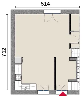 Il living misura circa 36,5 mq, di cui circa 11 occupati dalla cucina per la quale è prevista una composizione angolare a L addossata ai due muri perimetrali.