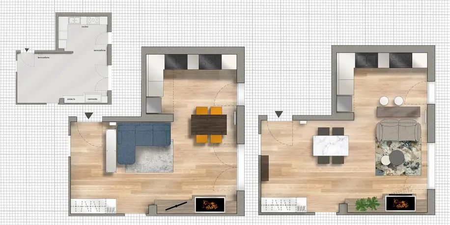 In questo caso ci troviamo in un ambiente particolarmente vincolato: l’ambiente è finito e sono già presenti alcuni arredi. Non è pensabile intervenire con lavori troppo invasivi e, quindi, si deve cercare di adattare lo spazio, tenendo alcuni punti fissi come la cucina, la tv e il caminetto.