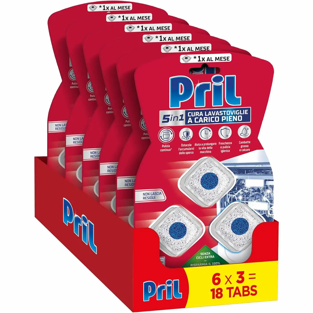 Le pastiglie cura lavastoviglie di Pril si usano a pieno carico. Ogni confezione ne contiene 3. Si usano una volta al mese per garantire lunga vita all’apparecchio, sempre pulito, igienizzato e profumato. Prezzo: 20,94 euro per un pack da 6 su amazon.it
