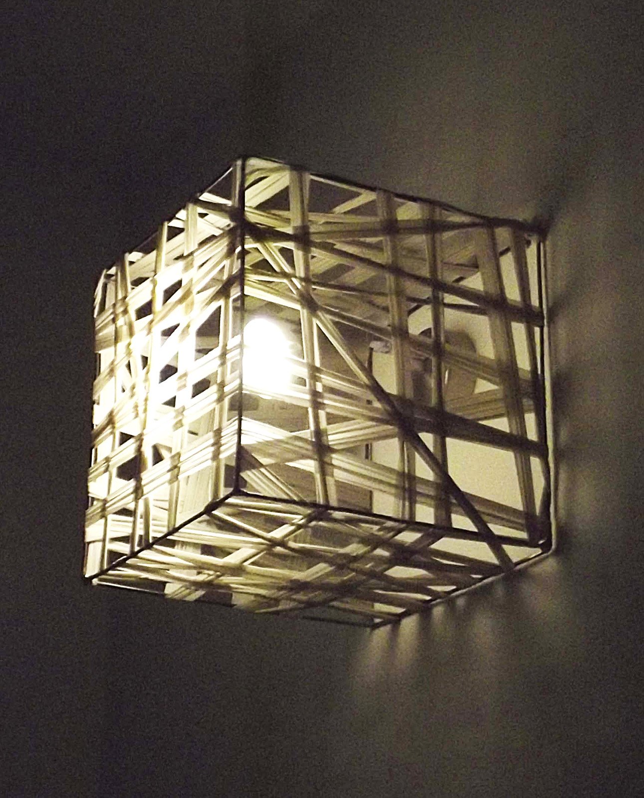 Nel dettaglio, il filo di ferro va spezzato in quattro parti, una maggiore della misura di 180 cm e tre di lunghezza 20 cm. Il pezzo più lungo deve essere piegato in modo da formare due quadrati di lato 20 cm, collegati da un pezzo centrale di lunghezza sempre pari a 20 cm. Piegare poi i due quadrati a 90° rispetto al pezzo di collegamento e posizionare in fasi successive i tre pezzi restanti da 20cm, saldando i punti di giunzione (n°8 punti di saldatura): si ottiene così la struttura del cubo. Dopodiché è necessario annodare un estremo della fettuccia a uno degli spigoli della faccia posteriore che rimarrà contro il muro e sarà necessario lasciare vuota. Bisogna che i nodi di fissaggio rimangano i più nascosti possibile in base al posizionamento della lampada e/o coprendoli con uno dei passaggi successivi della fettuccia. Avvolgete attorno alla struttura del cubo la fettuccia più volte, senza mai attraversare l’interno, eventualmente facendo un nodo ogni tanto per fissarla meglio.