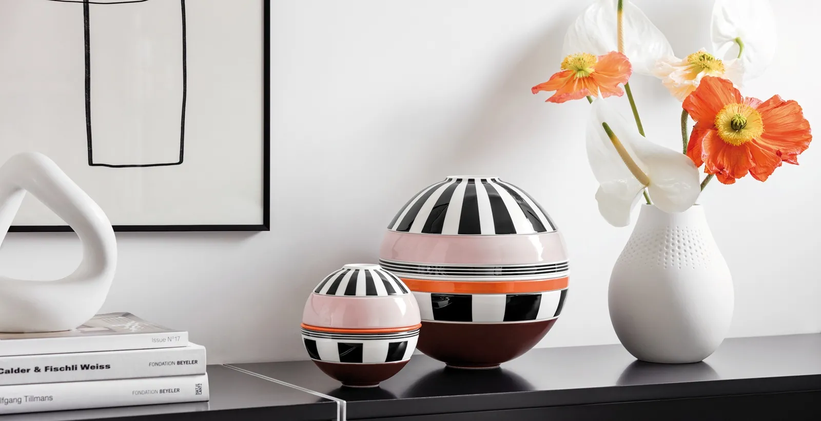 - Memphis, che celebra il design rivoluzionario degli anni ’80 con forme geometriche e colori vivaci. Su una base classica bianca e nera si aggiungono tocchi di rosa, arancione e bordeaux che insieme formano un ensemble elegante e gioioso