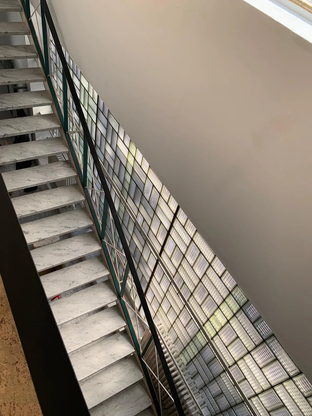 Scala in marmo e vetrata in vetrocemento a Villa Pestarini. foto Luigi Fiano