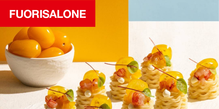 Installazione Edible Reveries da FULAR in via Melzo 34: piccole sculture di pasta stampata in 3D con dettagli food design, su tavola minimal dai toni giallo e azzurro. Progetto di Artisia e Barilla per il Fuorisalone 2026.