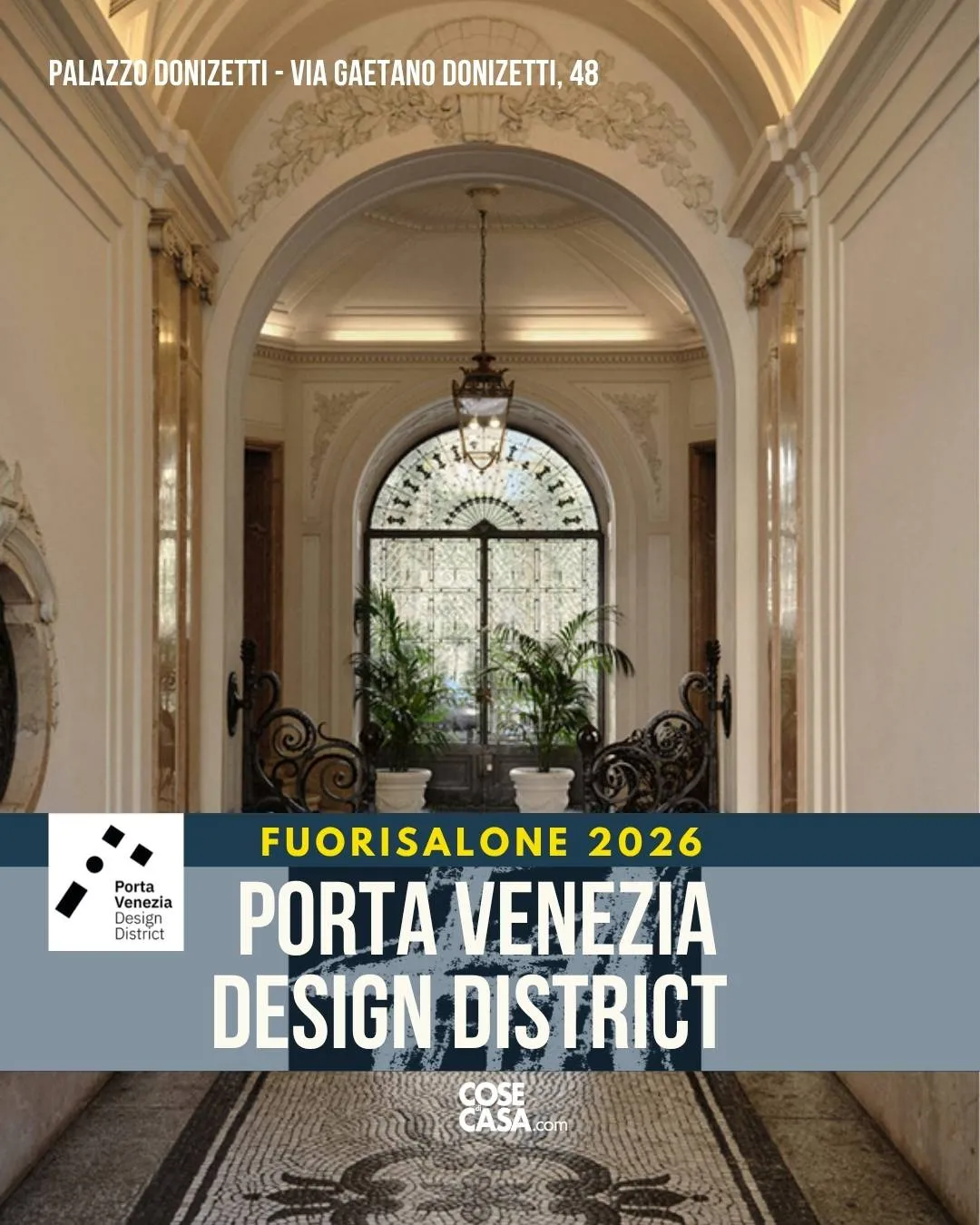 Ingresso elegante di Palazzo Donizetti a Milano, con soffitti decorati, lampadario centrale e pavimento a mosaico. L’Appartamento by Artemest è un percorso immersivo tra interior design e artigianato italiano.