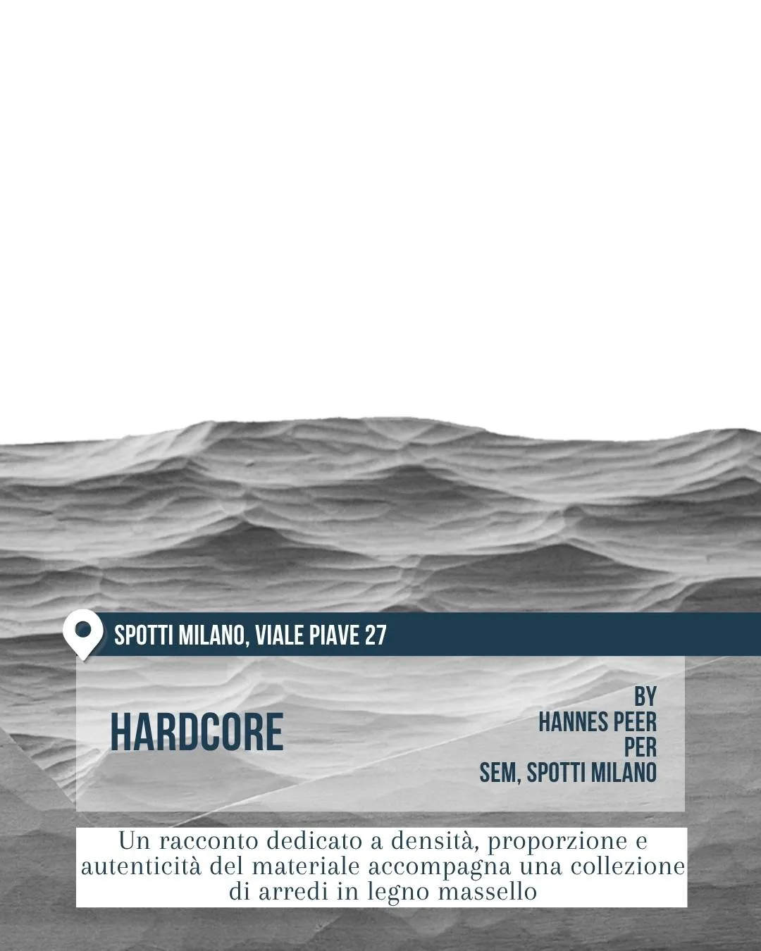 Superficie grigia scolpita come un paesaggio ondulato in bianco e nero nello spazio Spotti Milano, viale Piave 27. Hardcore di Hannes Peer per SEM e Spotti Milano racconta densità, proporzione e autenticità del materiale attraverso arredi in legno massello.