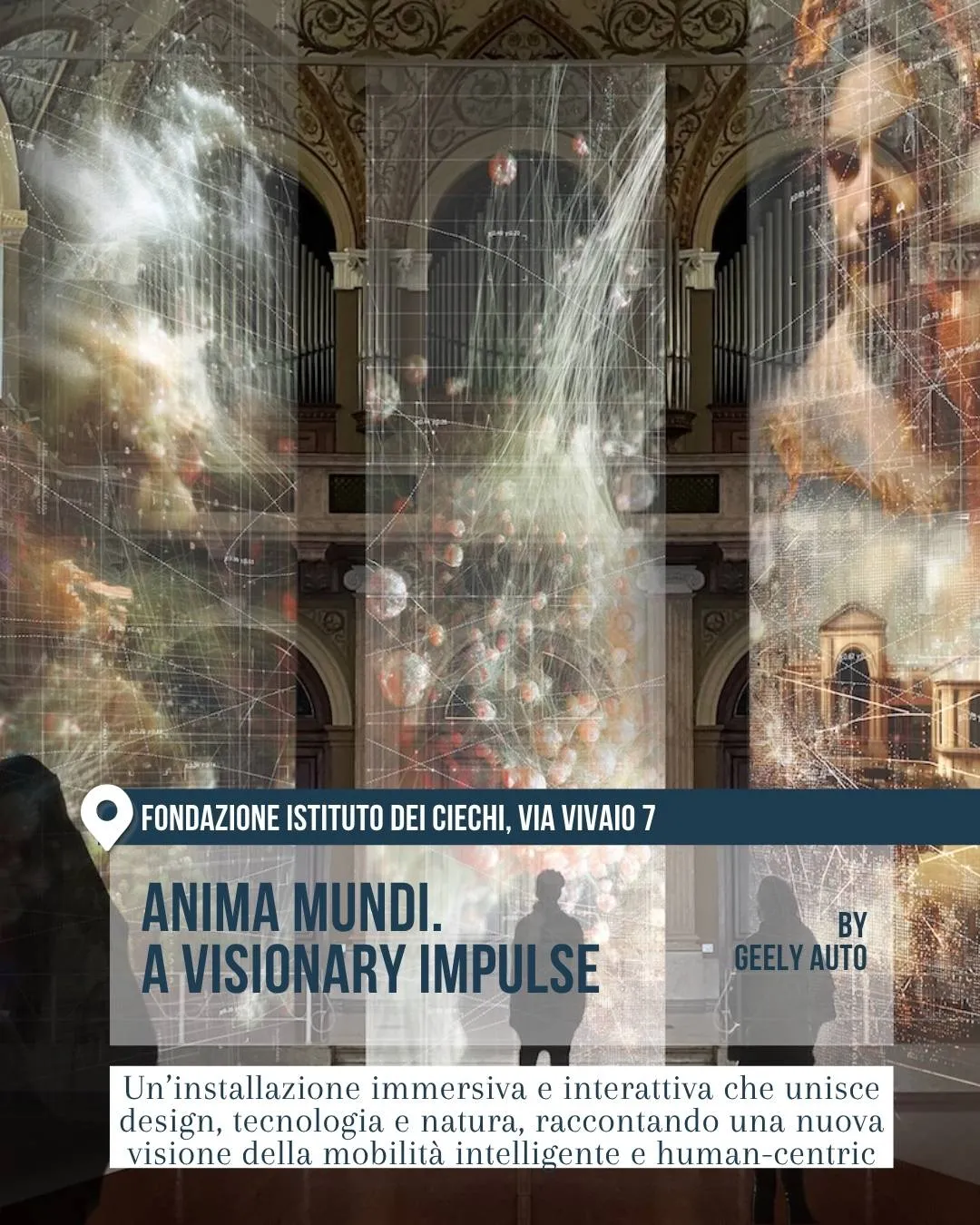 Spazio immersivo alla Fondazione Istituto dei Ciechi, via Vivaio 7, con grandi veli luminosi e immagini digitali sospese in un ambiente storico. L’installazione Anima Mundi. A Visionary Impulse di Geely Auto unisce design, tecnologia e natura.