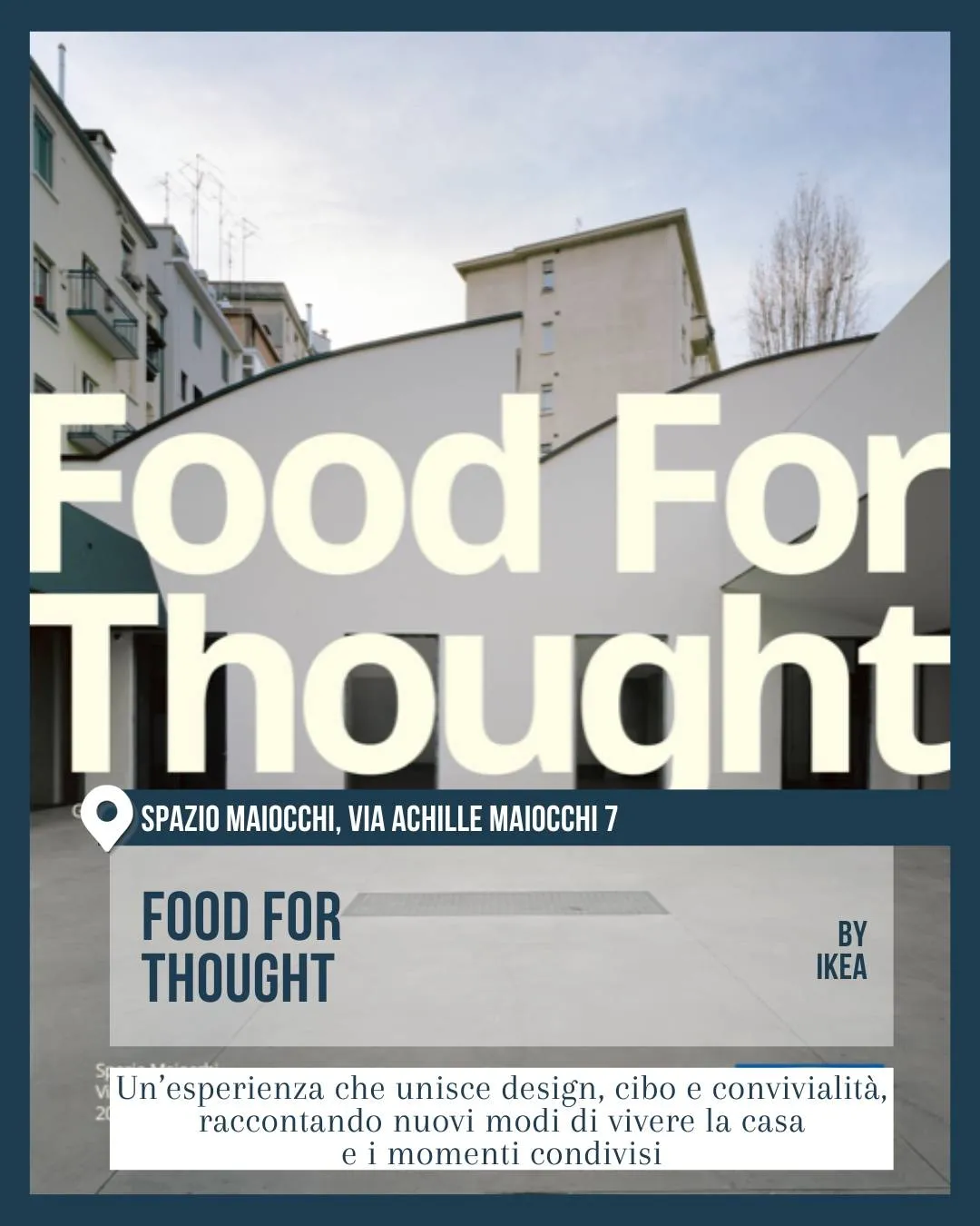 Cortile di Spazio Maiocchi, via Achille Maiocchi 7, con grafica oversize e architettura essenziale. Food for Thought by IKEA propone un’esperienza tra design, convivialità e nuovi modi di vivere la casa al Fuorisalone 2026.