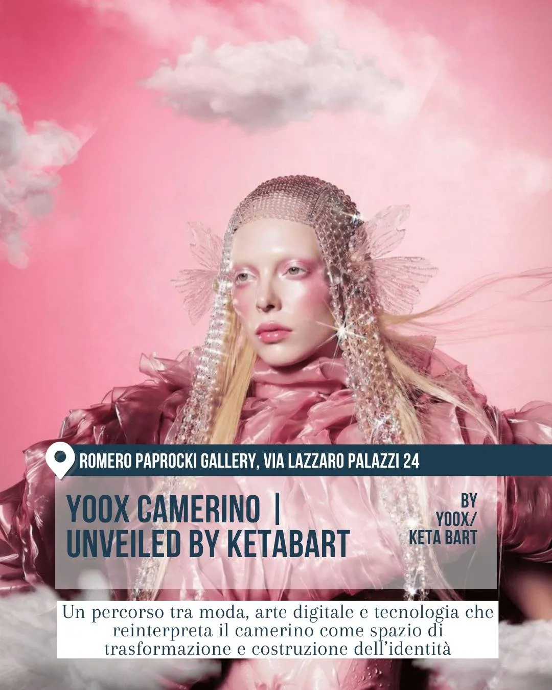 Ritratto fashion in tonalità rosa nello spazio Romero Paprocki Gallery, via Lazzaro Palazzi 24. YOOX Camerino Unveiled by Ketabart esplora il camerino come luogo di trasformazione tra moda, arte digitale e tecnologia.