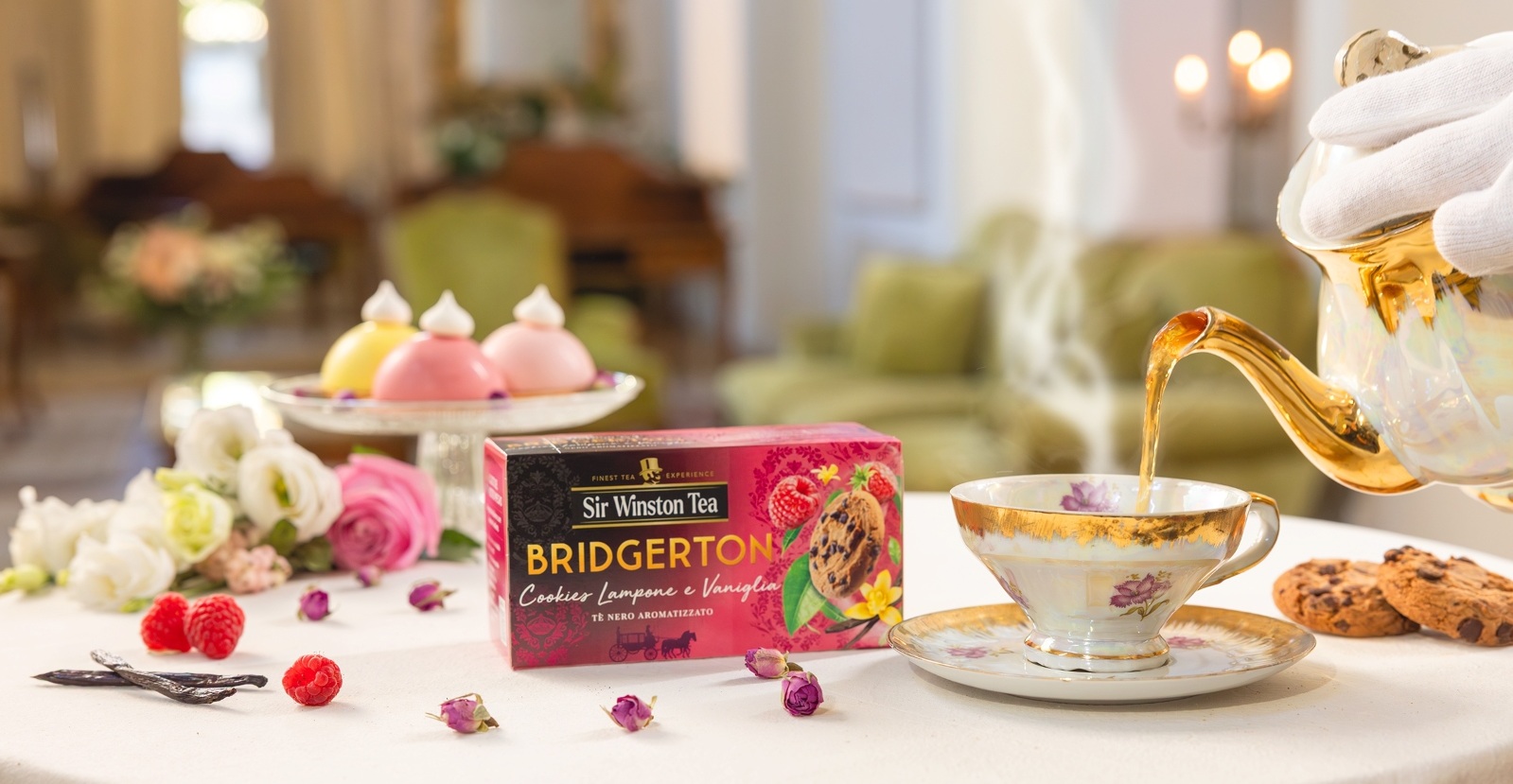 - Cookies Lampone e Vaniglia, una novità ispirata all’eleganza senza tempo di Bridgerton. Qui la dolcezza delle note di cookies, lampone e vaniglia si fonde con il sapore deciso delle foglie di tè