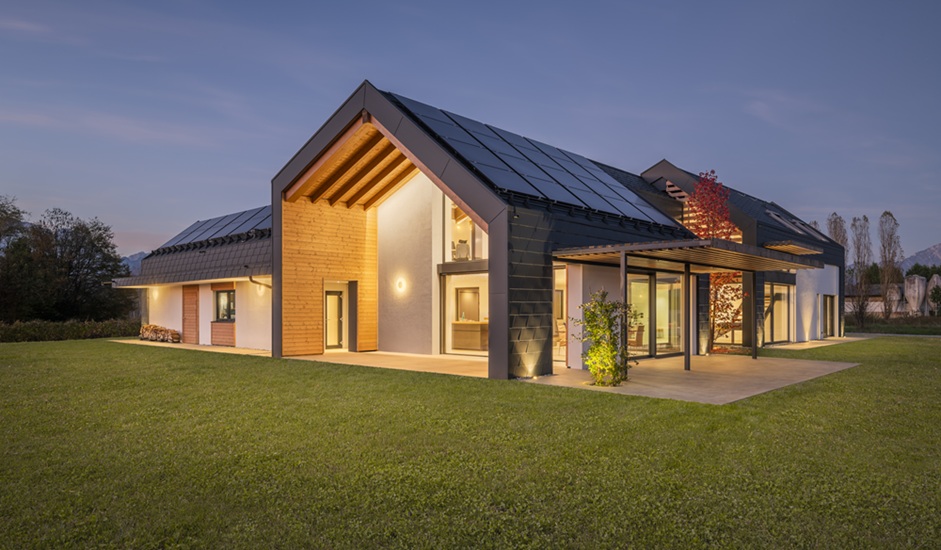 La copertura asimmetrica ospita pannelli fotovoltaici integrati, orientati in modo da massimizzare la produzione. L’energia elettrica viene stoccata in batterie e utilizzata per alimentare una pompa di calore aria-acqua, la ventilazione meccanica controllata, la produzione di acqua calda sanitaria e le colonnine per veicoli elettrici.