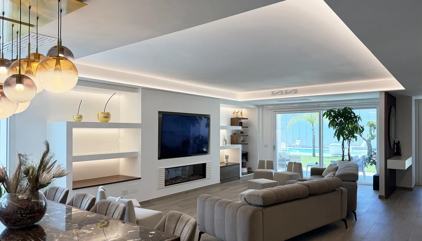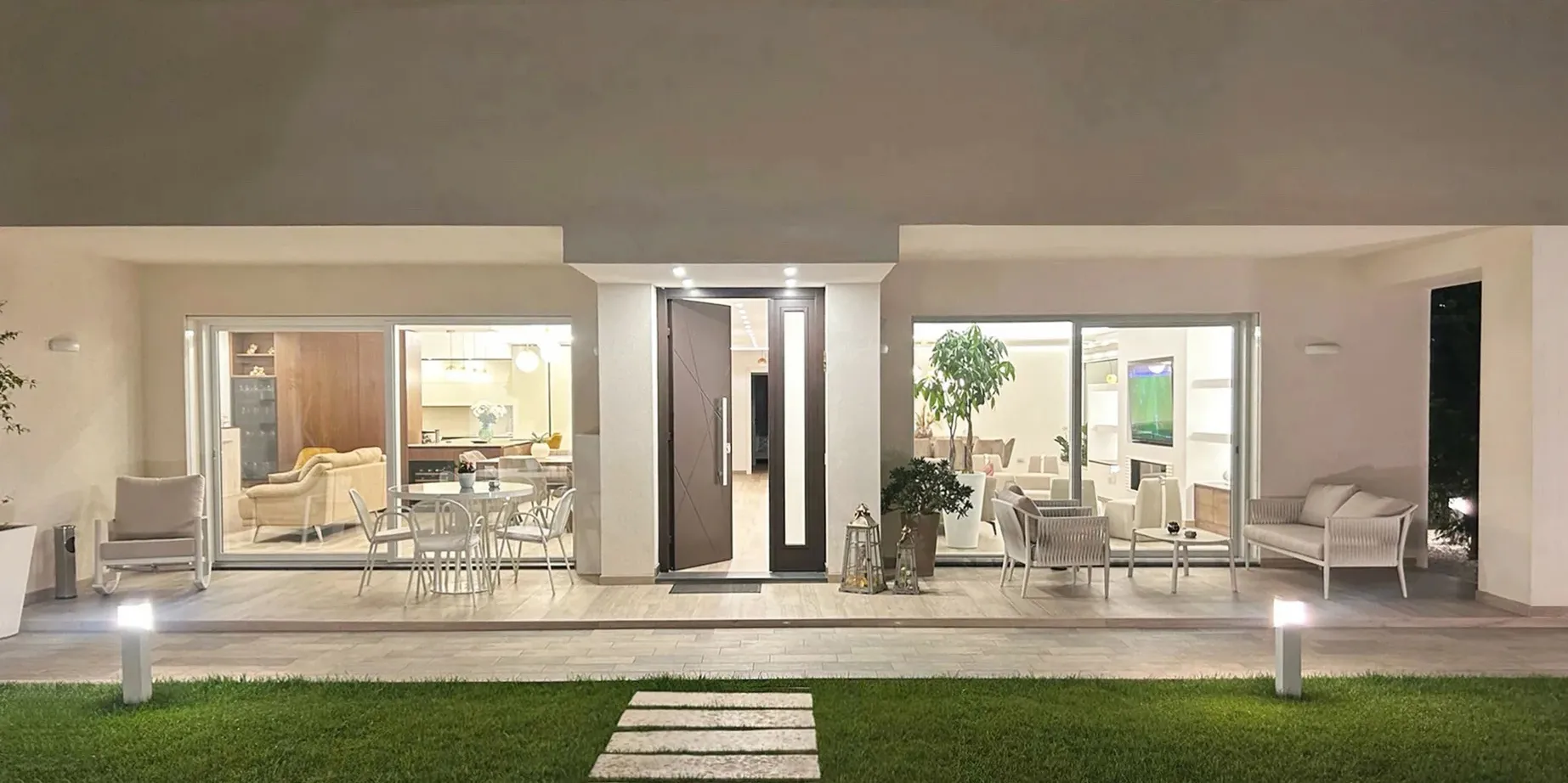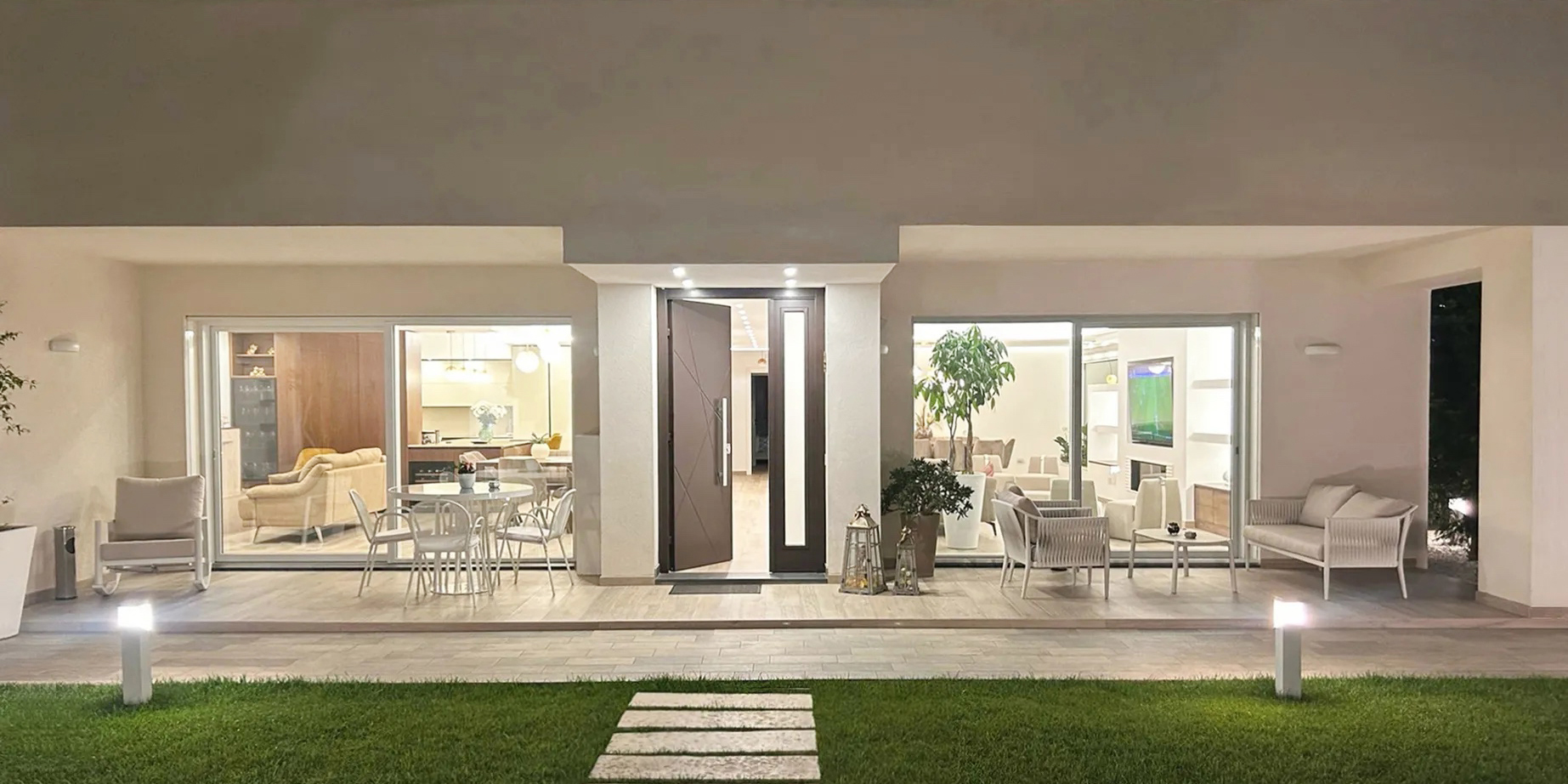 Gli ambienti interni dialogano costantemente con gli spazi esterni: ampie vetrate aprono la zona giorno e le camere verso il giardino, mentre due profonde sporgenze della copertura generano aree d’ombra coperte, ideali per vivere l’esterno in ogni stagione.