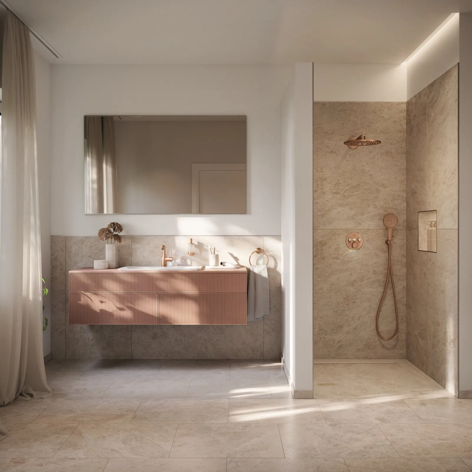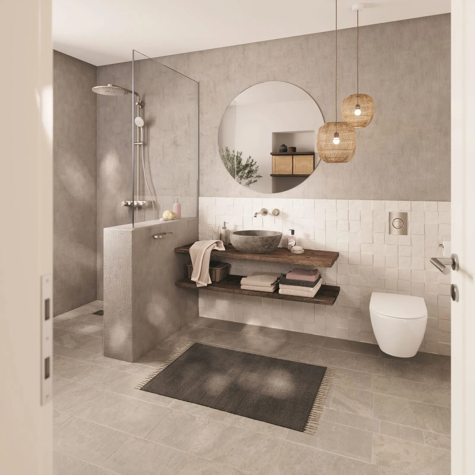 Per il 2026 si conferma l’interesse per le tonalità metalliche, che si abbinano sia a materiali caldi come il legno sia a superfici lussuose come il marmo. Tornano quindi alla ribalta il fascino dell’effetto ottone, il calore di oro e bronzo, l’eleganza del cromo spazzolato. La linea di rubinetteria GROHE Essence (disponibile nelle colorazioni PVD Oro, Oro Rosa, Grigio Antracite e Cromo Spazzolato) si abbina alle docce GROHE SmartControl e alla linea di accessori Essentials, unendo funzionalità e stile.