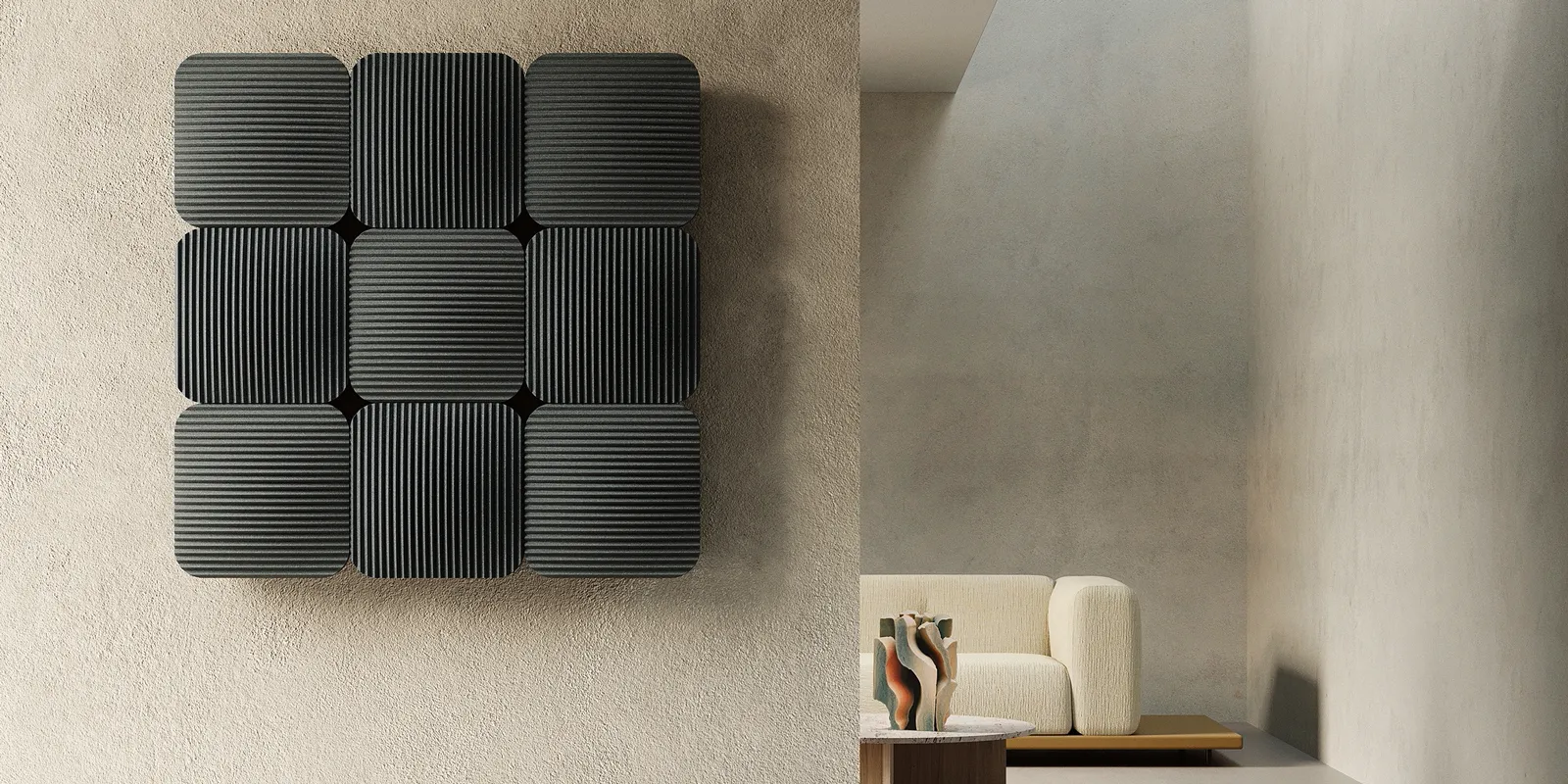 Lana della collezione Griffe di Antrax IT è componibile, a partire da moduli di L 33 x P 33 cm: in alluminio, con angoli stondati ed effetto bombato, sono orientabili in orizzontale o verticale. La superficie è plissettata, a ricordare un tessuto, in diversi colori. Nella misura L 99 x H 99 cm prezzo 2.390 euro + Iva. http://www.antrax.com