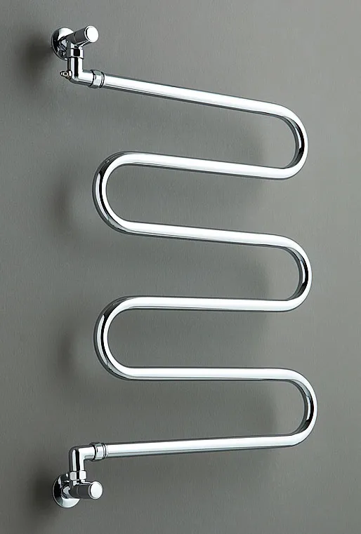 Sinuosa forma a serpentina per il radiatore SSERP6 di Bleu Provence, adatto in bagno come scaldasalviette o in altri ambienti. È realizzato in ottone in 18 finiture metalliche. È idraulico, elettrico o misto. Misura L 65 x H 76 cm. Con finitura cromata od ottone naturale, prezzo da 1.290 euro + Iva. http://www.bleuprovence.it