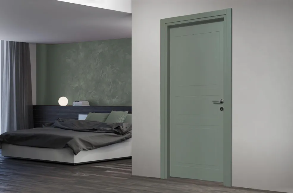 Le superfici, disponibili nelle colorazioni RAL e NCS, generano un effetto morbido e uniforme. Le porte includono serratura meccanica centromediana e cerniere cilindriche di tipo anuba. A richiesta: serratura magnetica e cerniere a scomparsa.
