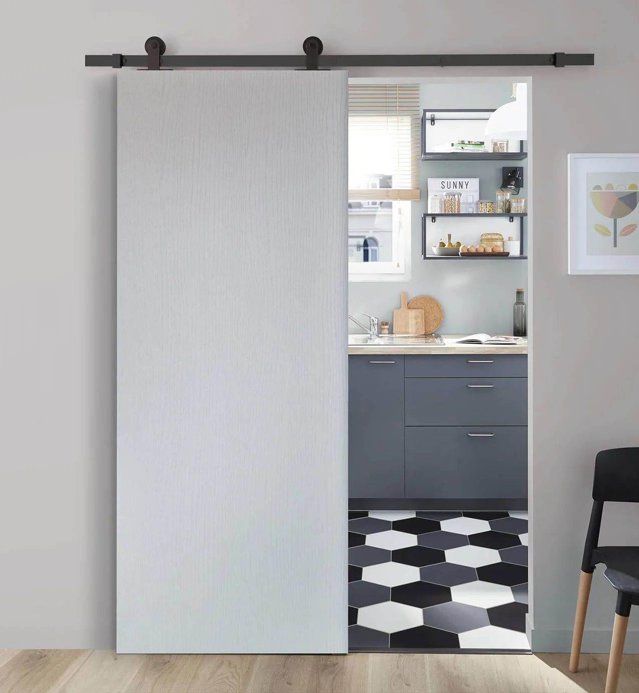 È realizzata in mdf la porta scorrevole Renoir di Leroy Merlin con anta laccata in bianco e binario in alluminio nero in stile Industrial, può essere aperta sia a destra che a sinistra, perfetta per separare gli ambienti. Misura L 92,5 x H 211,5 cm, il prezzo è 189,80 euro. https://www.leroymerlin.it