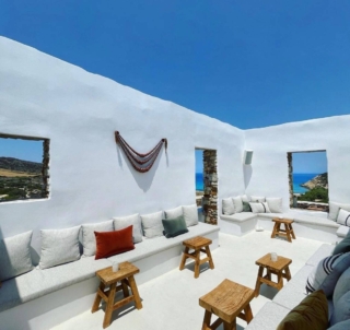 In questa foto c’è una situazione molto particolare: siamo in una vera stanza, ma senza tetto: ci sono le pareti, in cui sono ritagliate le finestre che guardano verso il mare e la campagna circostante. L’arredo è semplicissimo ma molto curato: il perimetro è circondato da pedane in muratura dipinte di bianco che grazie ai cuscini diventano comodi divani. Ci sono poi tanti tavolini in legno naturale, che servono da appoggio e che si possono spostare dove serve. Pochissimi pezzi, ma in grado di creare un’atmosfera piacevole e che possono diventare uno spunto di ispirazione da copiare anche per un giardino o un terrazzo.