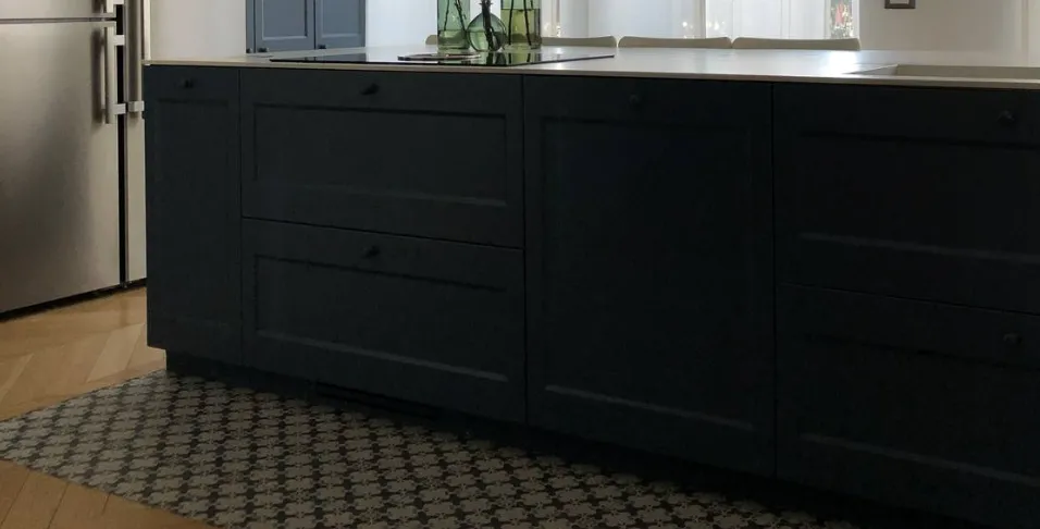 Cucina con parquet a spina ungherese e piastrelle messe solo sotto l’isola operativa centrale della cucina