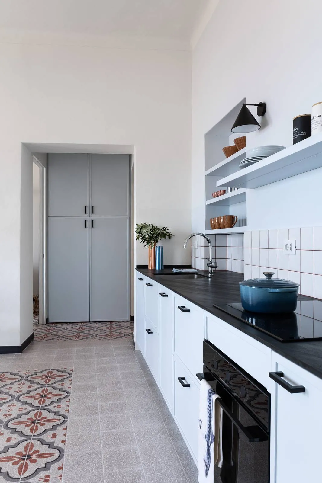 Iniziamo con una proposta particolare: un ingresso e un soggiorno in cui sono stati conservati entrambi i pavimenti originali in cementinecon fantasie completamente diverse: geometriche e floreali. Qui prima c’era una parete, ma il nuovo progetto ha cercato di ampliare lo spazio  con la creazione di una grande apertura, che lascia correre la vista ma continua a definire i due spazi. Il punto di passaggio è stato compensato con una soglia in cemento rasata a mano e poi finita a resina, dipinta di colore nero per staccare completamente dal rosso e dal bianco delle mattonelle vicine. Il nero riprende anche i bordi che si ritrovano in corridoio e che delimitano i “tappeti” di piastrelle.